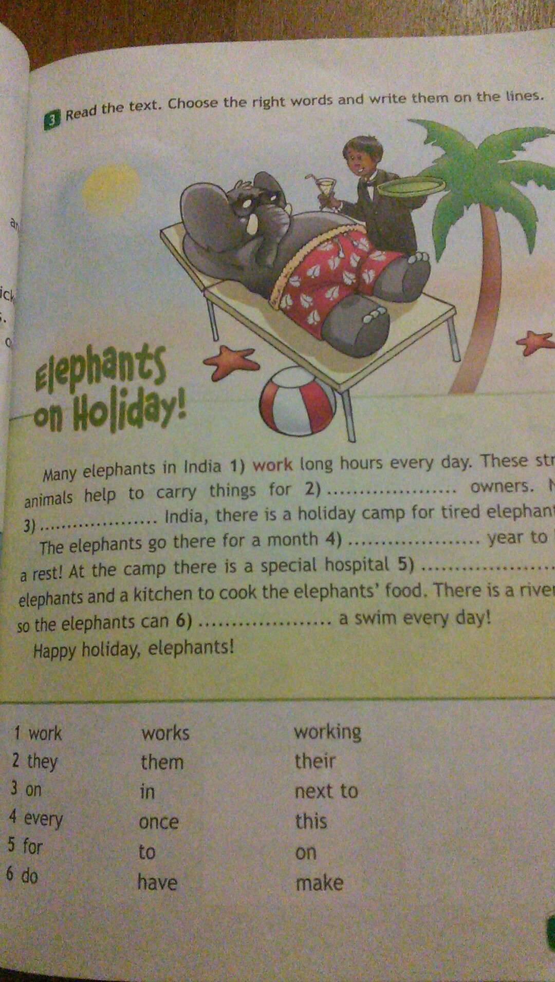 Прочитай текст. Выберите нужные слова и записать их на линиях. на выходных! Многие слоны в Индии 1) работают долгие часы каждый день. Эти животные помогают ул нести вещи 2) владельцев. M 3) .................... Индия, есть лагерь отдыха для уставших слон слоны идут там в течение месяца 4) год на отдых! В лагере есть специальная больница 5) слонов и кухня для приготовления пищи слонов. Существует реки, так что слоны могут 6) плавать каждый день! С праздником, слоны! работает 1 работа работает их они их 3 на 4 рядом с каждым это 5 для 3AKPblTb