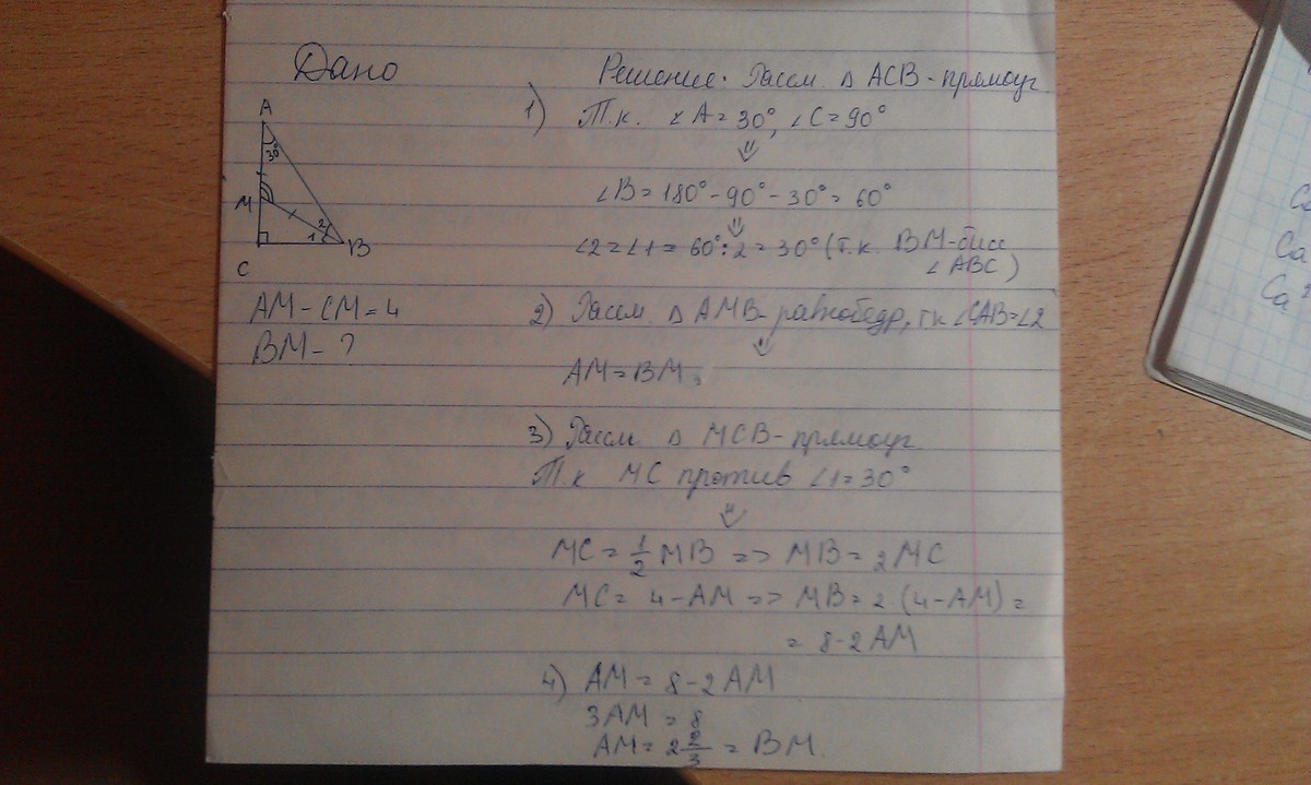 в треугольнике ABC: угол C = 90 градусов, угол A = 30 градусов. Биссектриса угла B пересекает катет AC в точке M. Найти: BM, если AM-CM=4 см.