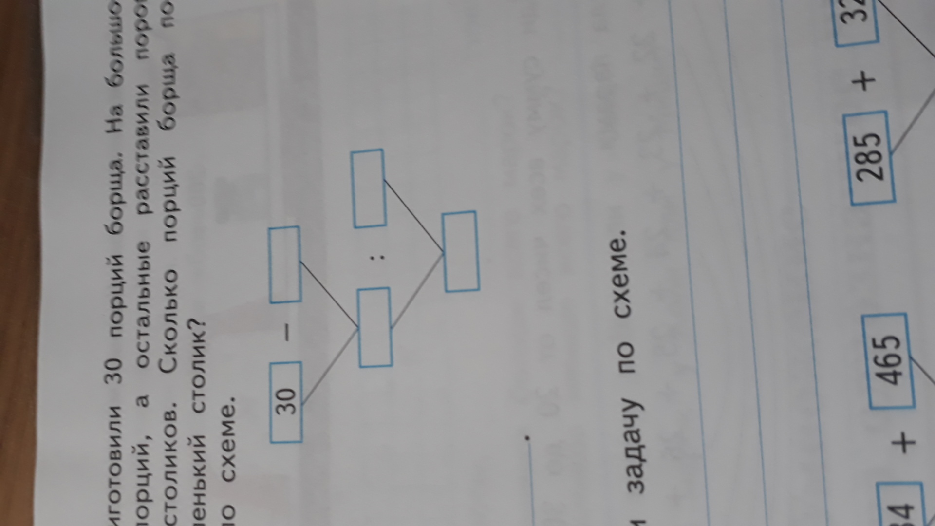 в столовой приготовили 30 порций борща на большой стол поставили 6 порций остальные расставили поровну на 8 маленьких столиков сколько порций борща поставили на каждый маленький столик реши задачу по схеме