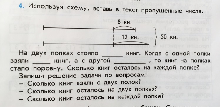 На двух полках стояло 50 книг. Когда с одной полки взяли 12 книг, а с другой 8,то книг на полке стало поровну.Сколько книг осталось на каждой полк?