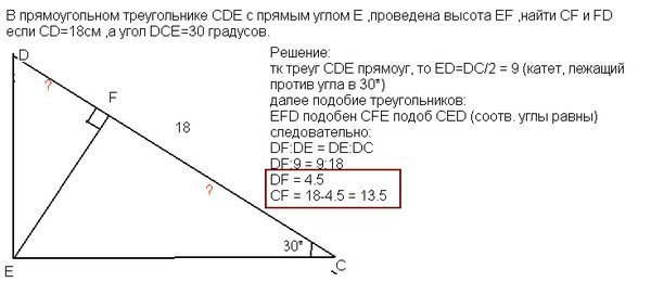 В прямоугольном треугольнике СDЕ с прямым углом Е проведена высота ЕF. Найдите СF и FD, если CD=18см, а DCE=30°.