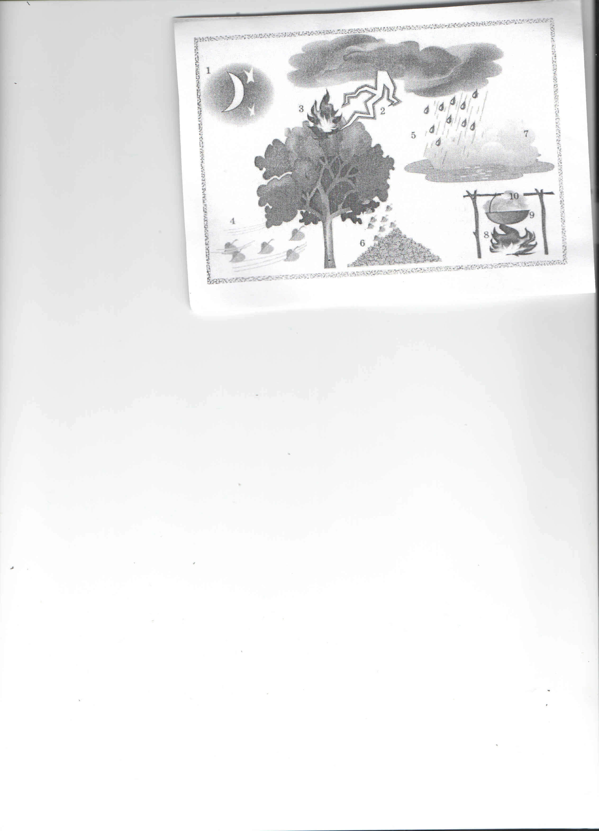 физические явления: дождь, испарение воды лужи, полёт листьев, сияние месяца, сияние молнии, свечение костра,