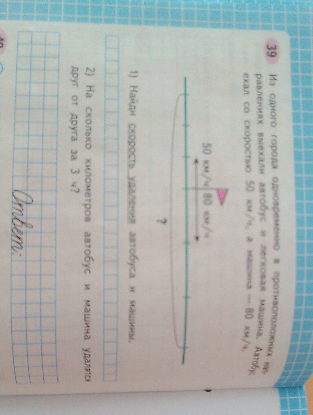 2) (50+80)*3=390км-скорость удаления автобуса и машины за 3 часа