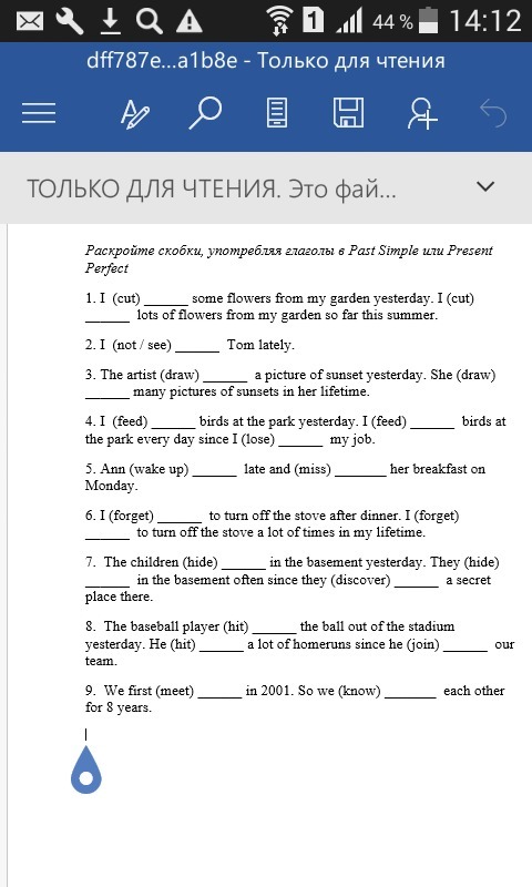 1. I cut ..., I have cut 2. haven't seen 3...drew ..., she have drown 4. I fed... , I feed ...I have lost 5.Ann has woken up ...missed...6. I forgot.., I have forgotten 7....hid..., hide ...they have discovered . 8. ...hit...have hit ,he have joined ...9...met . ...have knew .