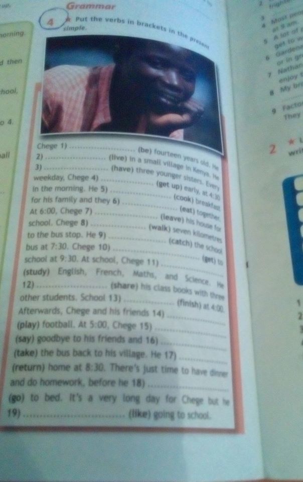 1 is 2 lives 3 has 4 gets up 5 cooks 6 eat 7 leaves 8 walks 9 catches 10 gets 11 studies 12 shares 13 finishes 14 play 15 says 16 takes 17 returns 18 goes 19 likes