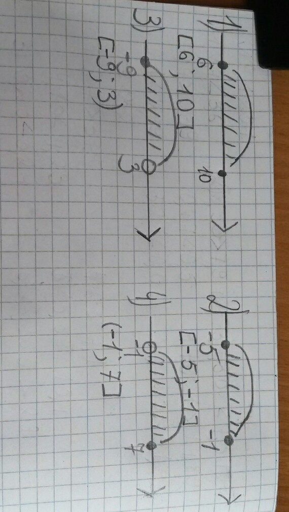 Изобразите на координатной прямой числовые промежутки: 1) [6;10]; 2)[-5;-1]; 3) [-9;3); 4) (-1;7] помогите пожалуйста дам 100 баллов