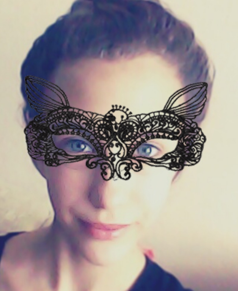 На ней красивая маска, у неё тёмно коричневые волосы, голубые или зелёные глаза просто не видно, красивые губы, сама она тоже красивая, кожа светлая беловатая вообщем девочка сама по себе красавица. Если помогла ставь спасибо пож