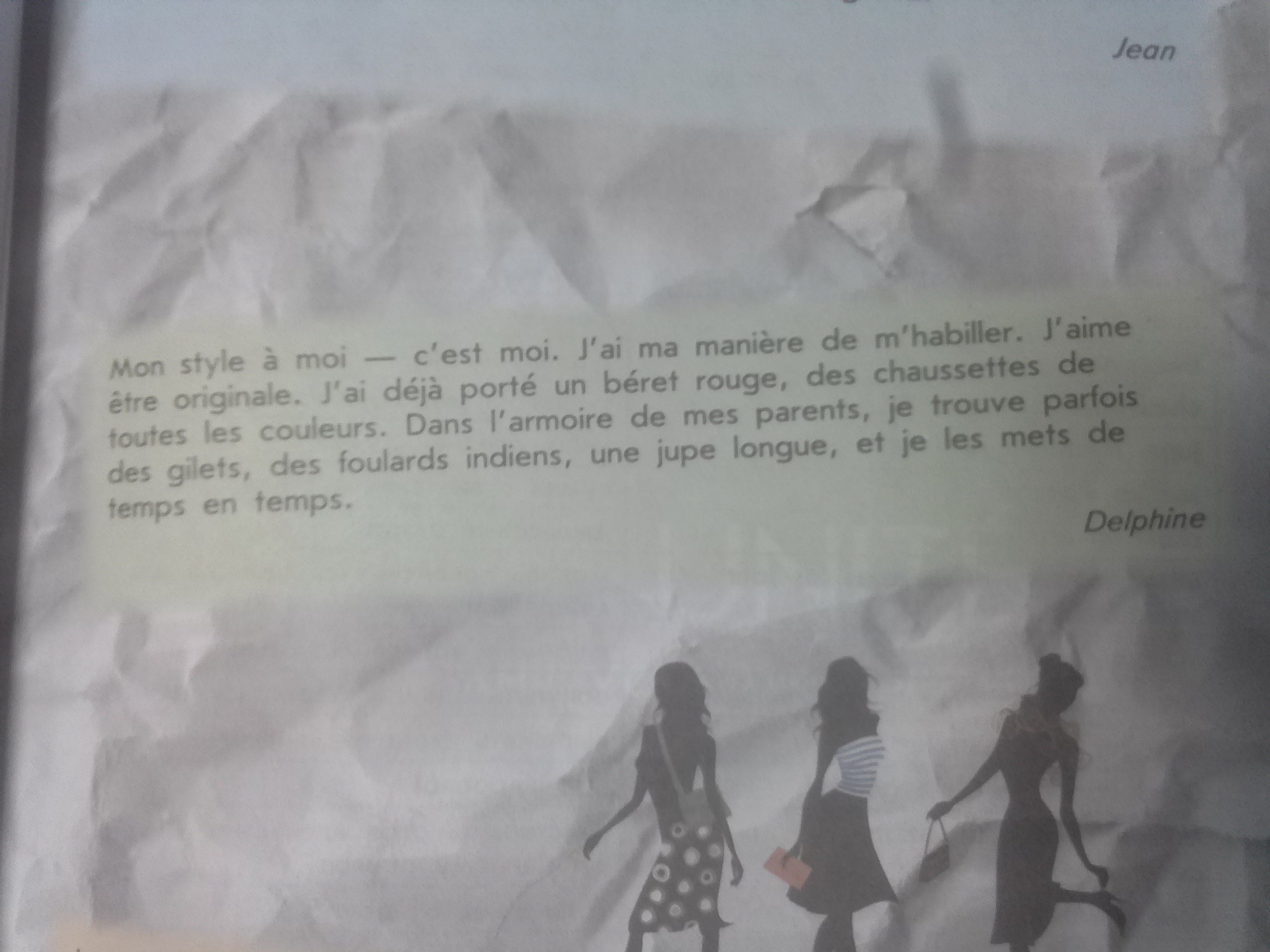 3.Мой стиль для меня это я. моя манера одеваться. Саи Мне нравится быть оригинальным. Я носил красный берет, носки всех цветов. В шкафу моих родителей, я иногда находят жилетов, индийские шарфы, длинную юбку, и я положил их время от времени. Дельфина