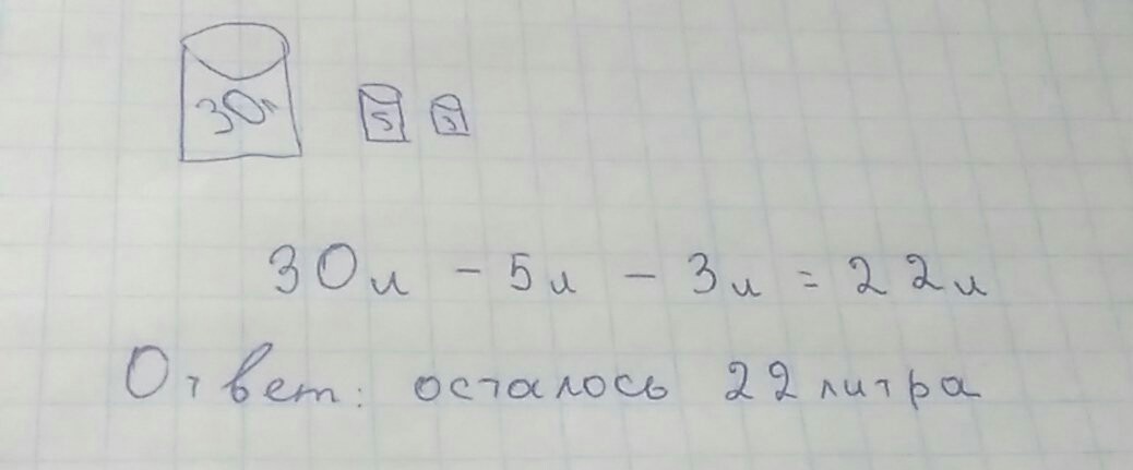 В бидоне 30 литров молока из него налили молоко в банке в одну 5 литр в другую 3 литра Сколько литров молока осталось в бидоне Реши задачу разными способами