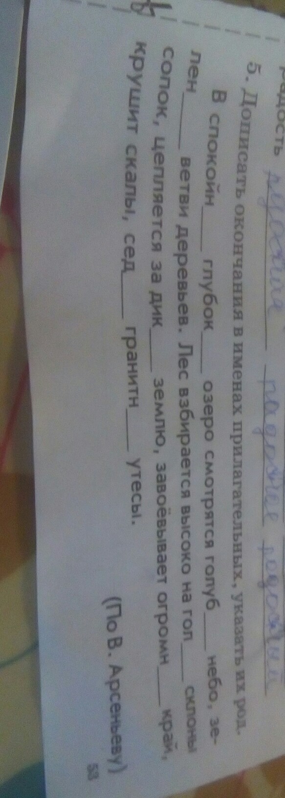 В спокойное глубокое озеро(ср.род) смотрятся голубое небо(ср род),зелёные ветви(ж.р) деревьев.