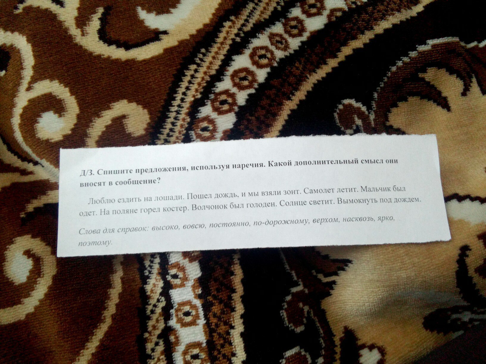 Люблю ездить верхом на лошади . Пошел дождь , и поэтому мы взяли зонт . Самолёт высоко летит . Мальчик был ярко одет . На поляне вовсю горел костёр. Волчонок был по-дорожному голоден . Солнце постоянно светит. Вымокнуть насквозь под дождем. )