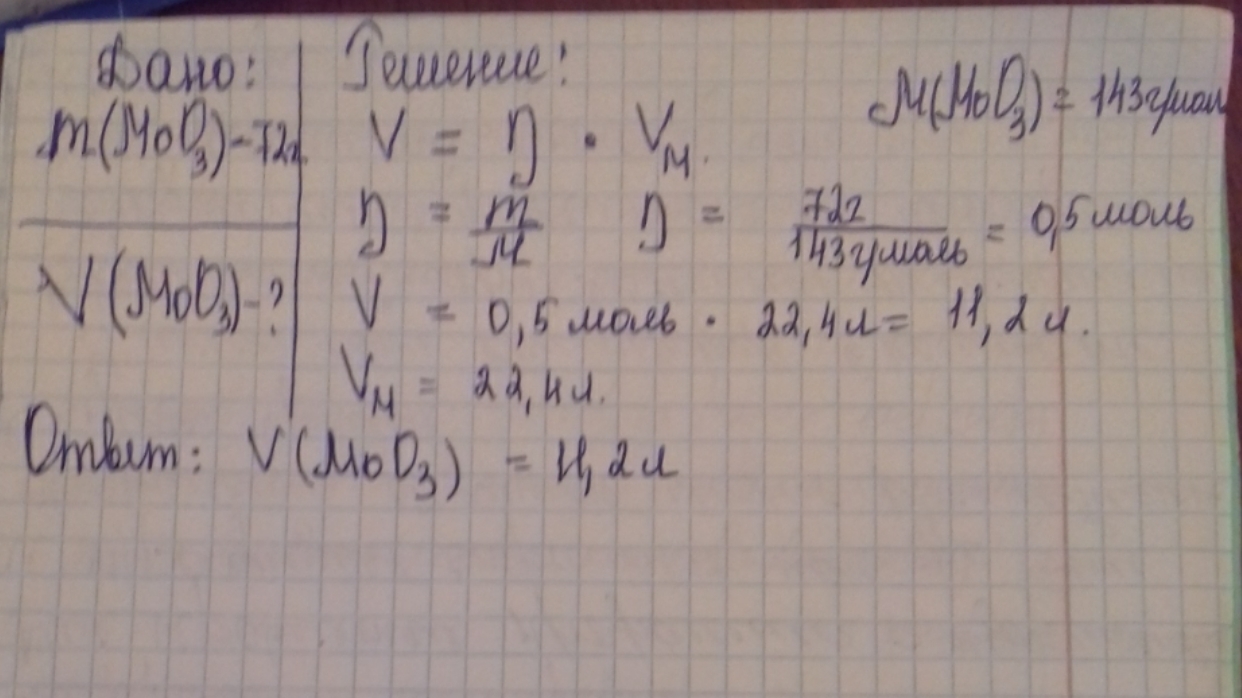 рассчитайте объем при н.у, который вступит в реакцию с 72г оксида молибена (VI) MoO3 ПОЖАЛУЙСТА ! С ДАНО И РЕШЕНИЕМ