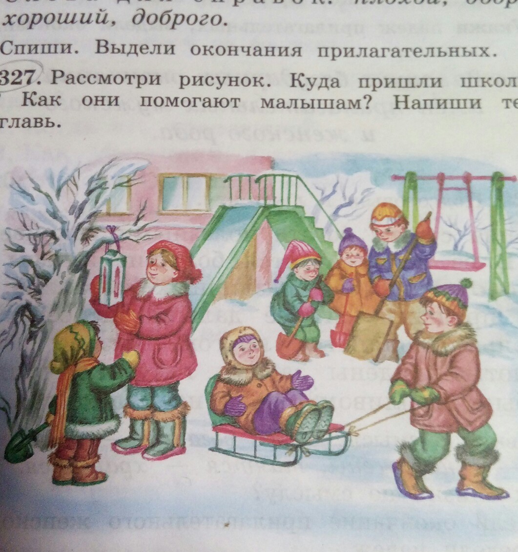 Название: Как Вася Петя и Даша помогли малышам Петя Вася и Даша проходили мимо садика, и решили помочь малышам. Даша помогла малышке Кате повесить кормушку для птиц,Вася покатал малыша Вову на санках, а Петя помог малышам раскопать снег. Пете помогали два малыша, Боря и Вова. Малышам было весело!