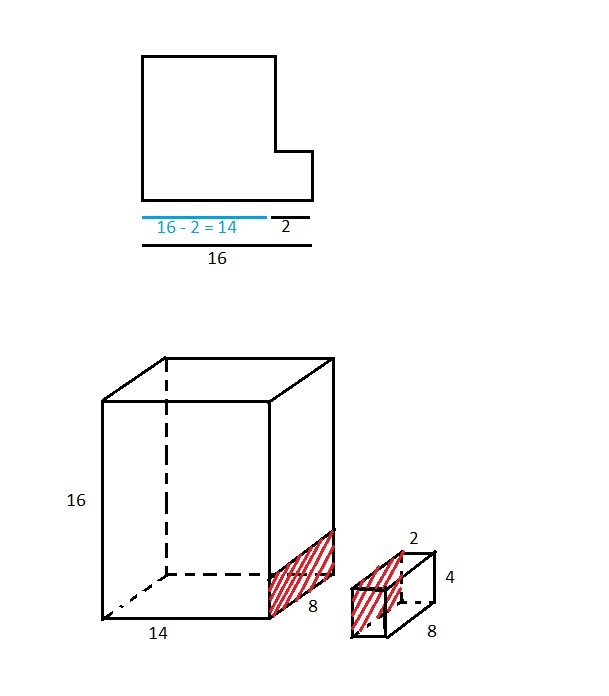 Полная площадь фигуры = площадь большего параллелепипеда + площадь меньшего параллелепипеда - 2*лишняя площадь
