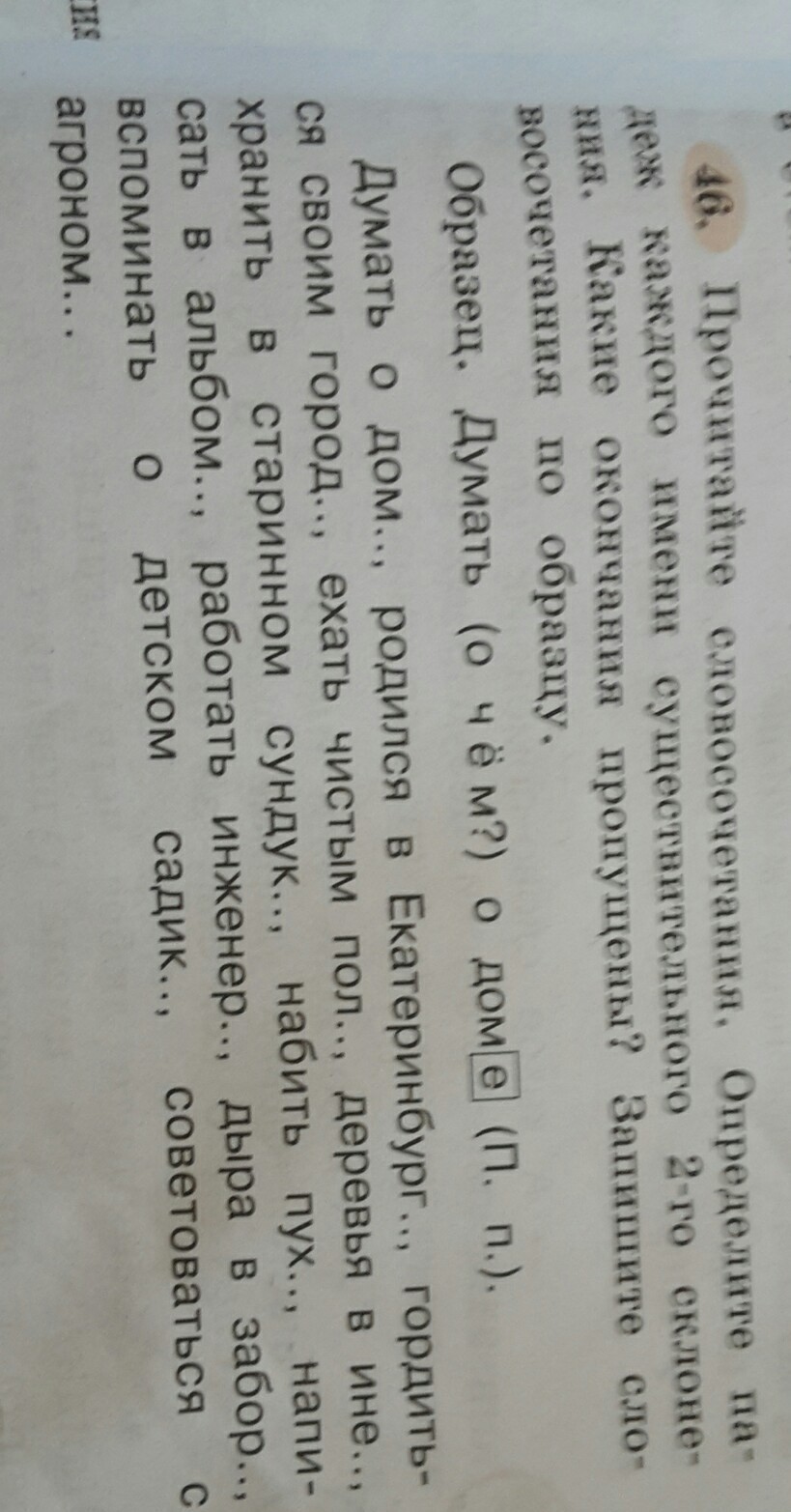 родился (где?) в Екатеринбурге П.п, гордиться (чем?) своим городом Т.п., деревья (в чём?) в инее П.п., хранить (в чём?) в старинном сундуке П.п, набить (чем?) пухом Т.п., написать в альбоме П.П, работать (кем?) инженером Т.п., дыра в заборе П.п, вспомнить (о чём?) о детском садике П.п, советоваться (кем?) с агрономом Т.п.