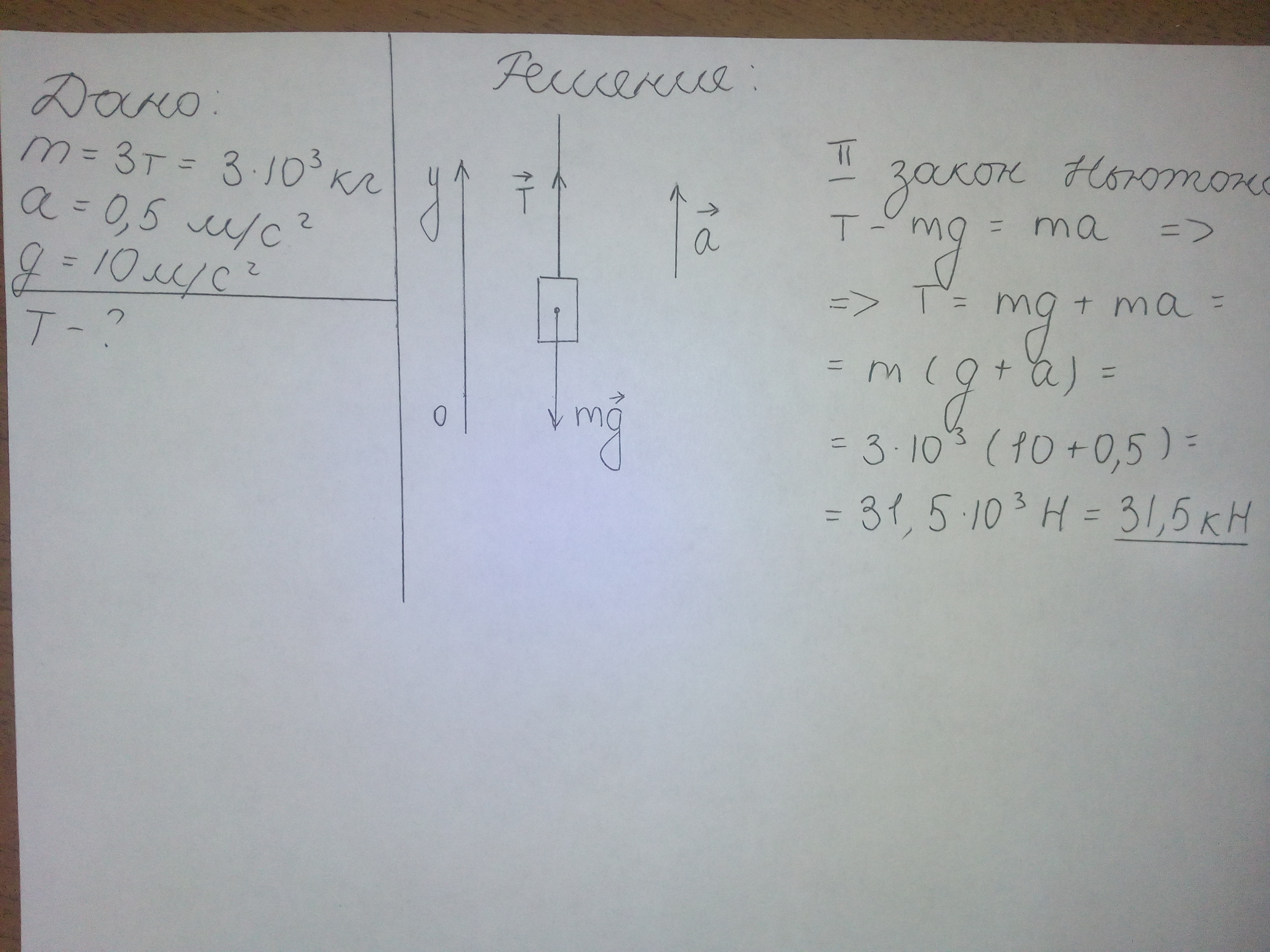 шахта лифта массой 3т начинает подниматься с ускорением 0,5 м/с². Определить силу натяжения троса.
