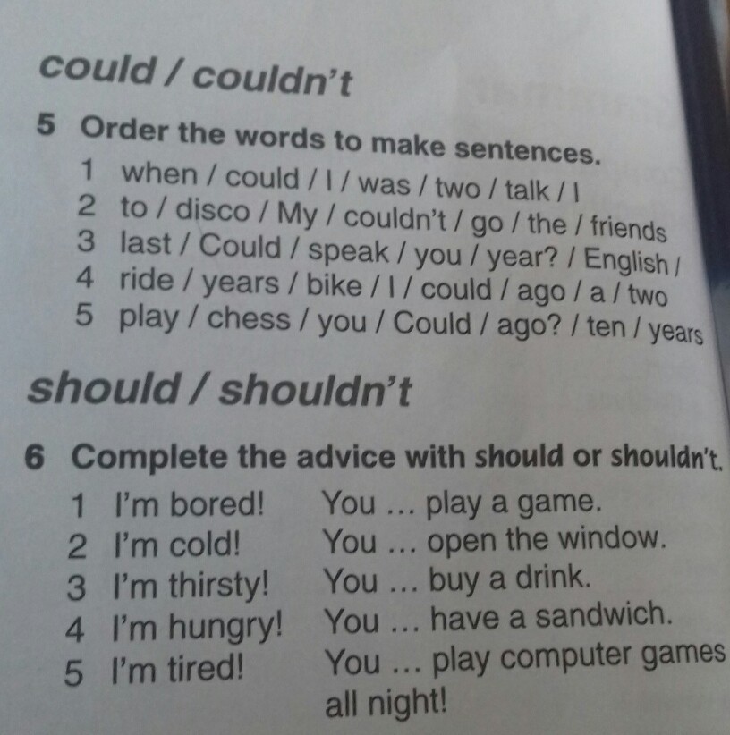 5. 1 could i talk when i was two 2 my friends couldn't go to the disco 3 could you speak english last year 4 i could ride bike a two years ago 5 could you play chess ten years ago 6. 1 should 2 shouldn't 3 should 4 should 5 shouldn't