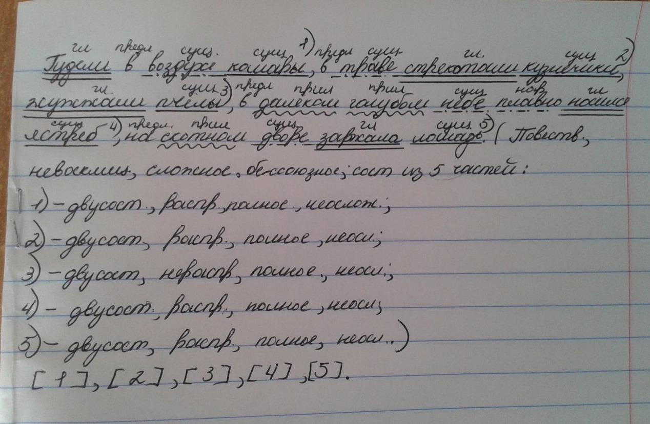 синтаксический разбор предложения Гудели в воздухе комары, в траве стрекотали кузнечик, жужжали пчёлы, в далёком голубом небе плавно носился ястреб, на скотном дворе заржала лошадь .