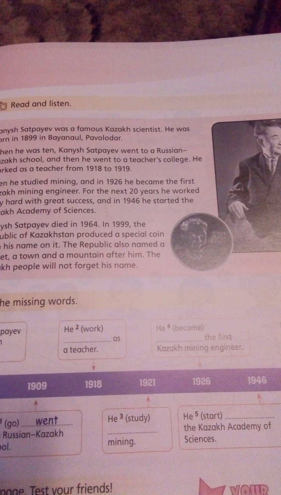 Каныш Сатпаев был великим Казахским ученым. Он родился в в 1899 году в Баян-Аульском районе Павлодарской области. Когда ему было 10, Каныш Сатпаев ходил в русскую (русскоязычную) казахскую школу, а затем учился в педагогическом институте. Он работал учителем с 1918 по 1919 год.
