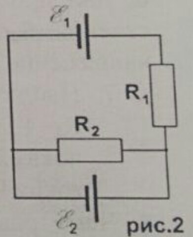 Две батареи подсоединены как показано на рисунке 2. Сила тока протекающая через резистор R2 равна 0,01 А. Величина сопротивлений R1=R2=10 Ом. Величина внутренних сопротивлений батарей равна r1=1 Ом, r2=0.5 Ом. Найдите величину э.д.с. источников тока E1 и E2.