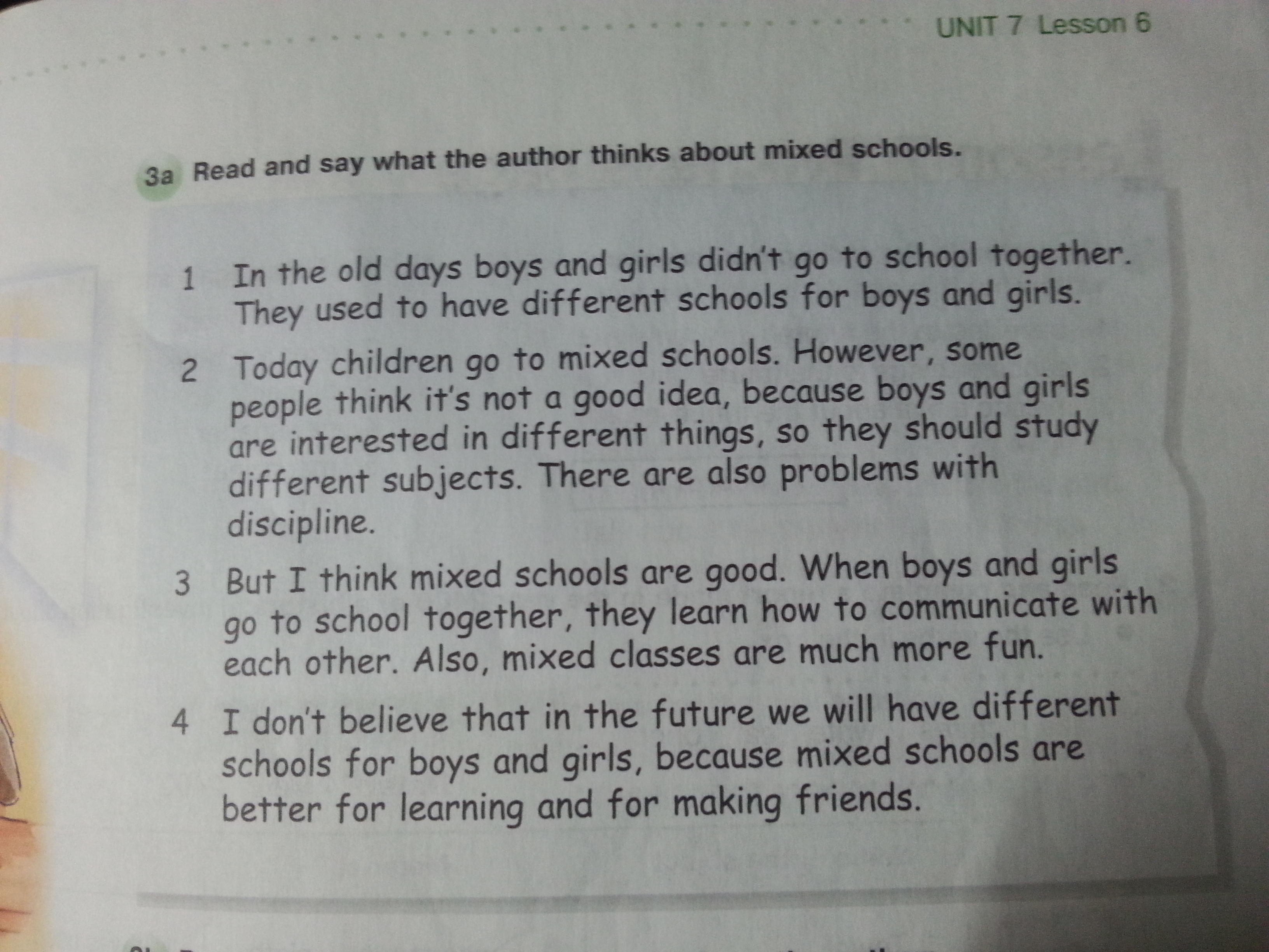 2 Сегодня дети ходят в смешанные школы. Тем не менее, некоторые люди думают, что это не очень хорошая идея, потому что мальчики и девочки заинтересованы в разных вещах, так что они должны изучать различные предметы. Есть также проблемы с дисциплиной.