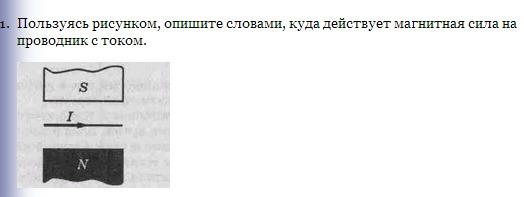 Пользуясь рисунком, опишите словами, куда действует магнитная сила на проводник с током.