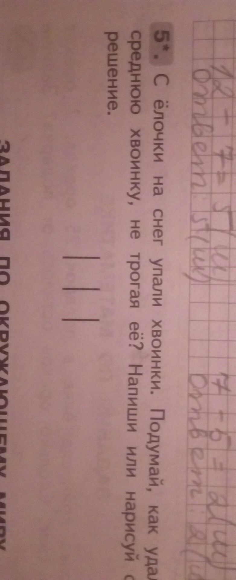 С елочки на снегу упали хвоинки. подумай, как удалить среднюю хвоинку, не трогая ее? напиши или нарисуй свои решение