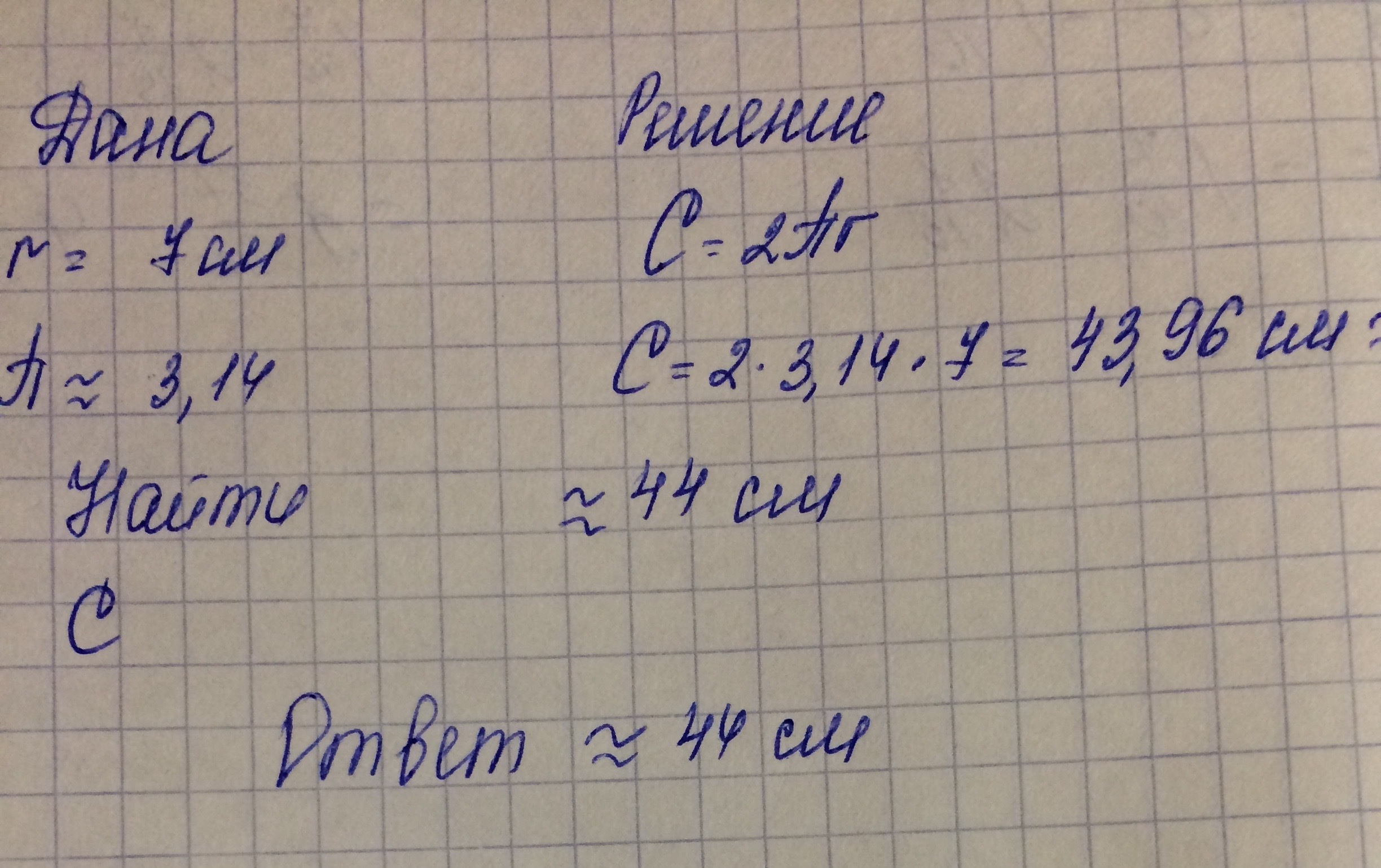 R = 7 см, тогда С = 2 · 3,14 · 7 = 43,96 ≈ 44 (см)