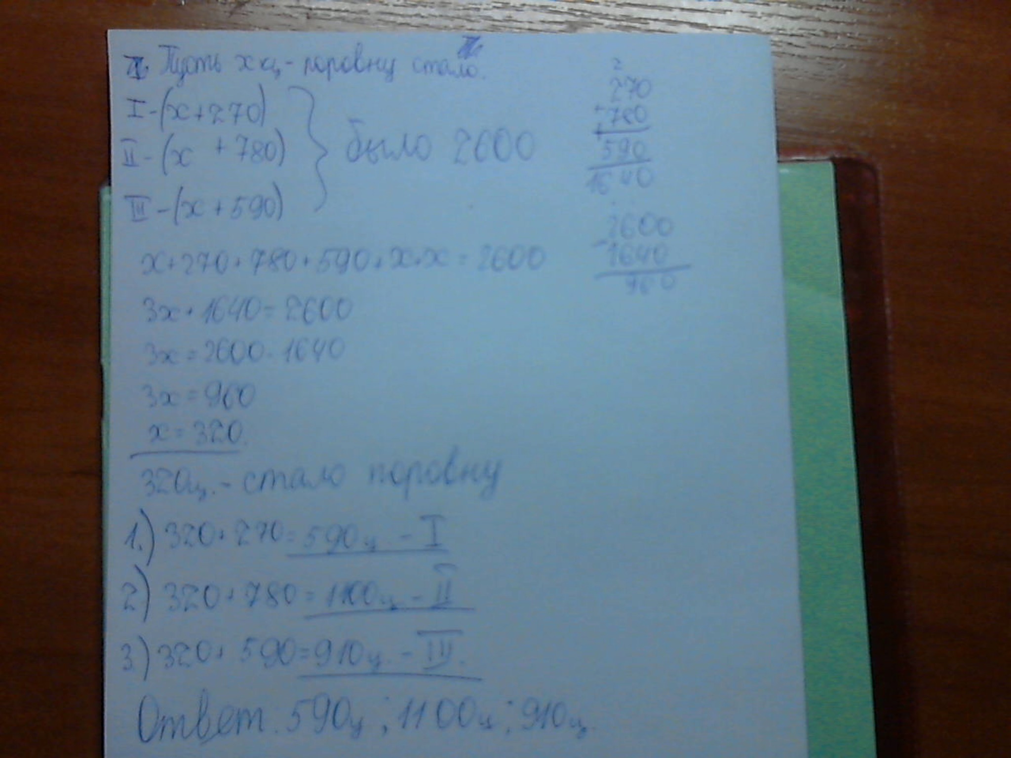На трёх овощных базах было 2.600 у овощей.Когда с первой базы увезли 270 ц , со второй — 780 ц , а с третьей — 590 ц , то на всех овощных базах стало овощей поровну . Сколько центнеров овощей было на каждой базе ?