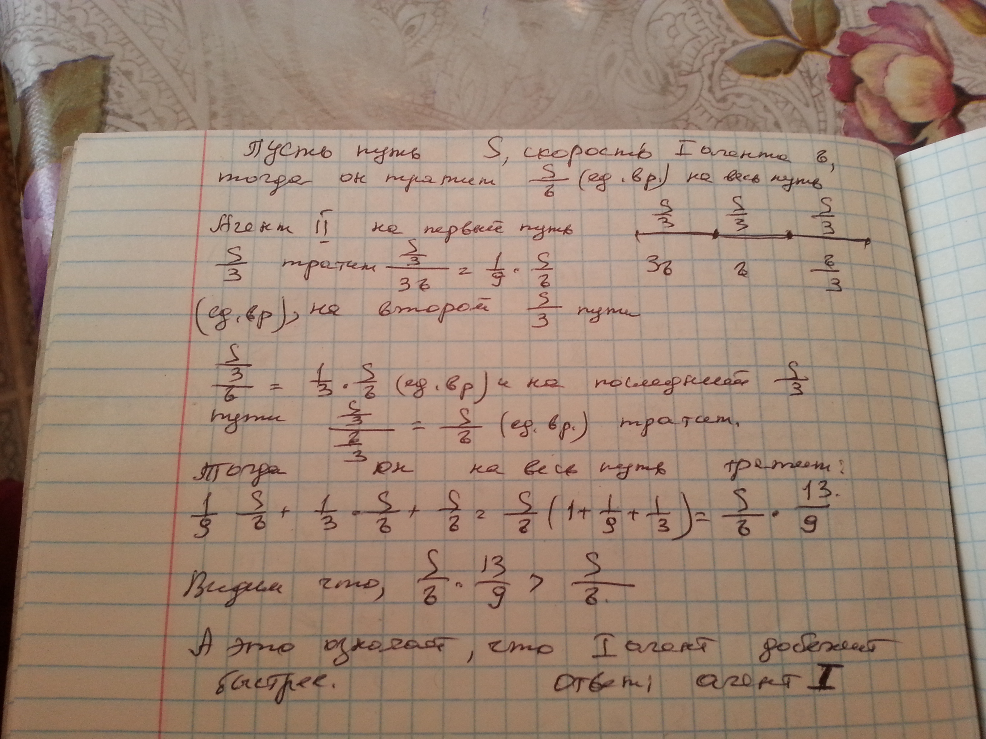 Агенты 1 и 2 бегут в свой секретный бункер. Агент 1 всё время бежит с постоянной скоростью, а агент 2 первую треть пути бежит со скоростью, в три раза большей скорости агента 1, вторую треть пути бежит со скоростью, равной скорости агента 1, и наконец последнюю треть пути он бежит со скоростью, в три раза меньшей скорости агента 1. Кто из них первым добежит до бункера?