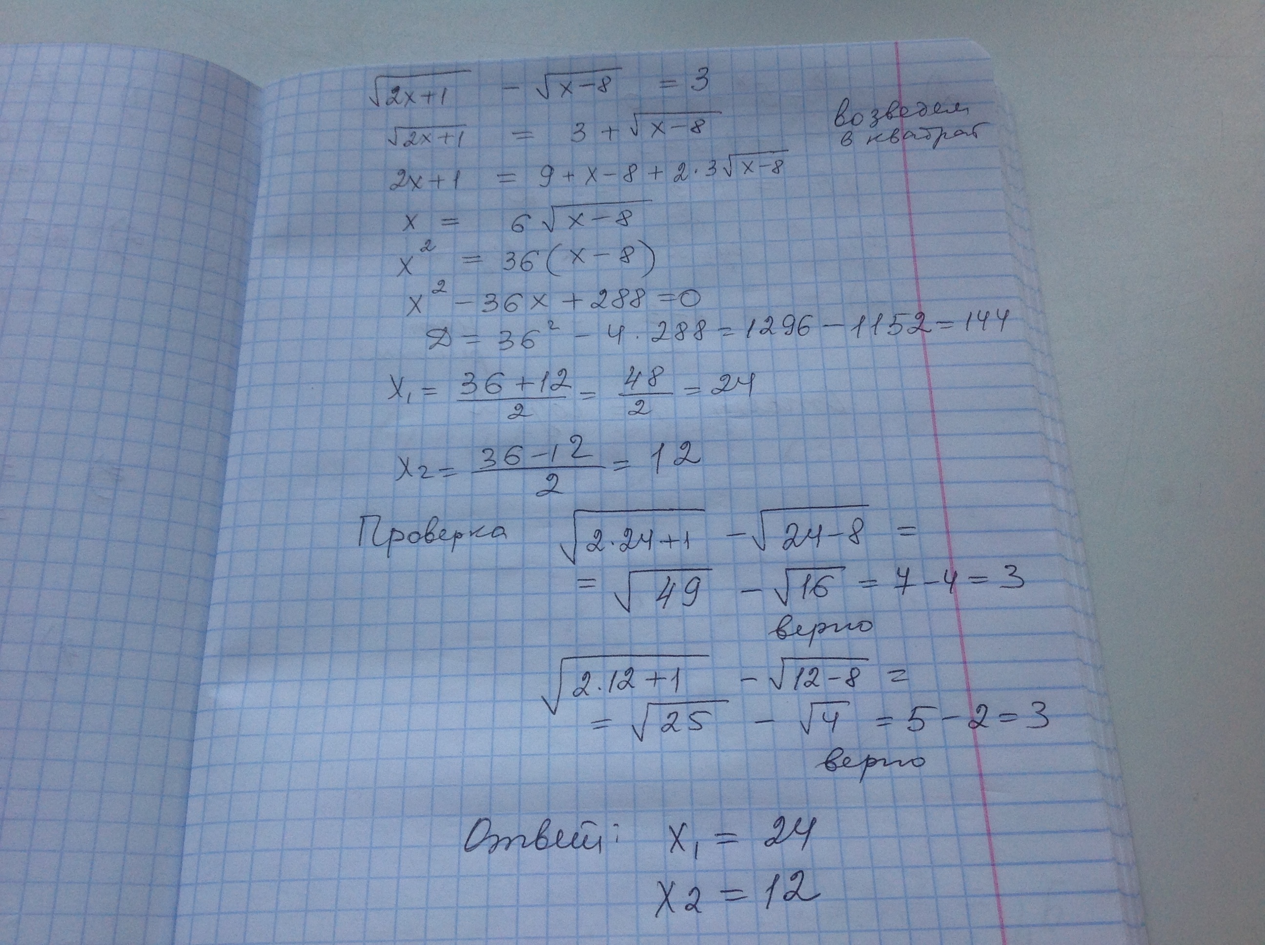 1)  sqrt(2*x+1)- sqrt(x-8)=3 <br /><br />