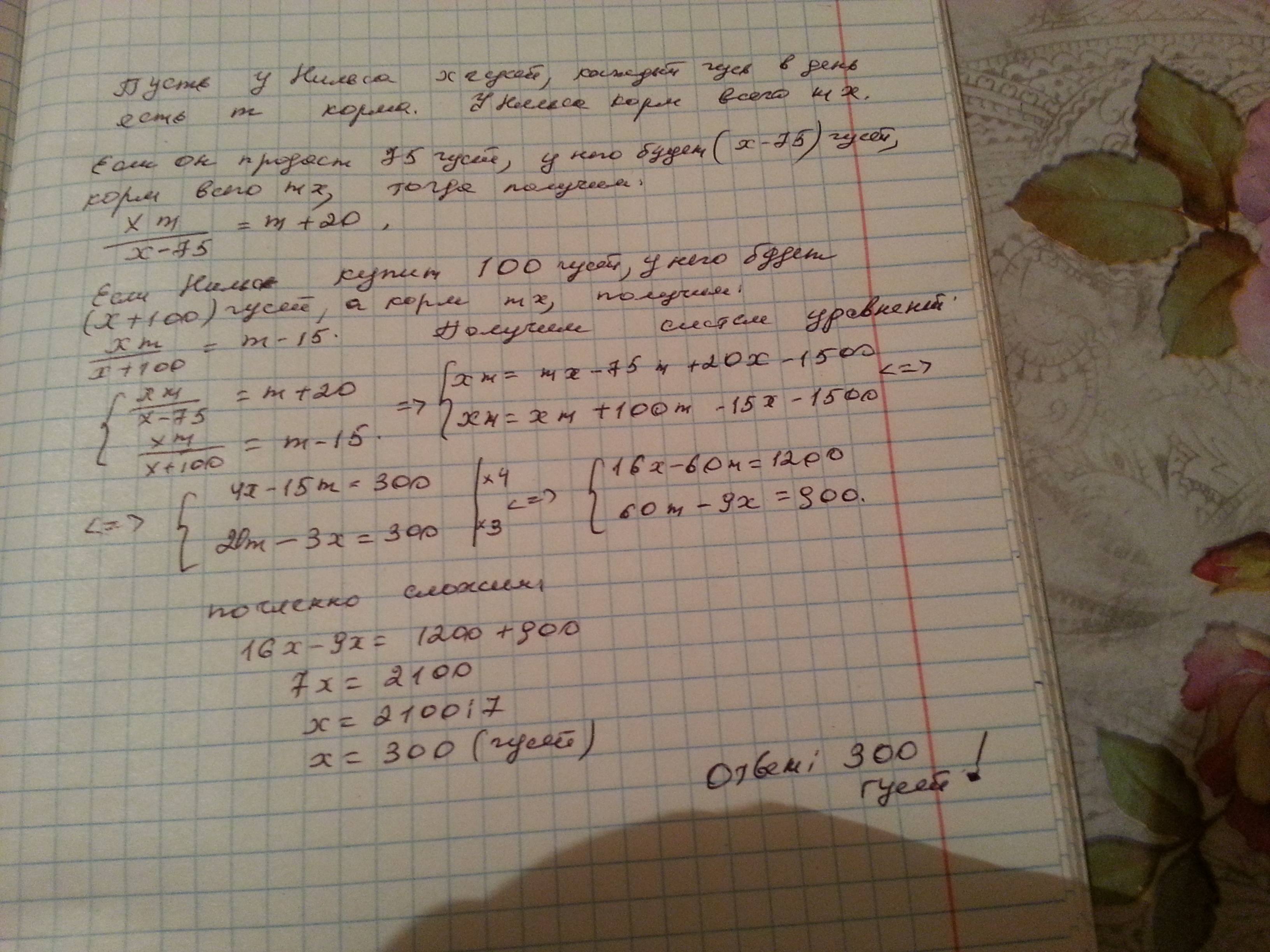 У Нильса гусиная ферма. Нильс подсчитал,что если продать 75 гусей,то корм закончится на 20 дней позже,чем если гусей не продавать. Если же купить 100 гусей,то корм закончится на 15 дней раньше,чем если такую покупку не совершать. Сколько гусей у Нильса?