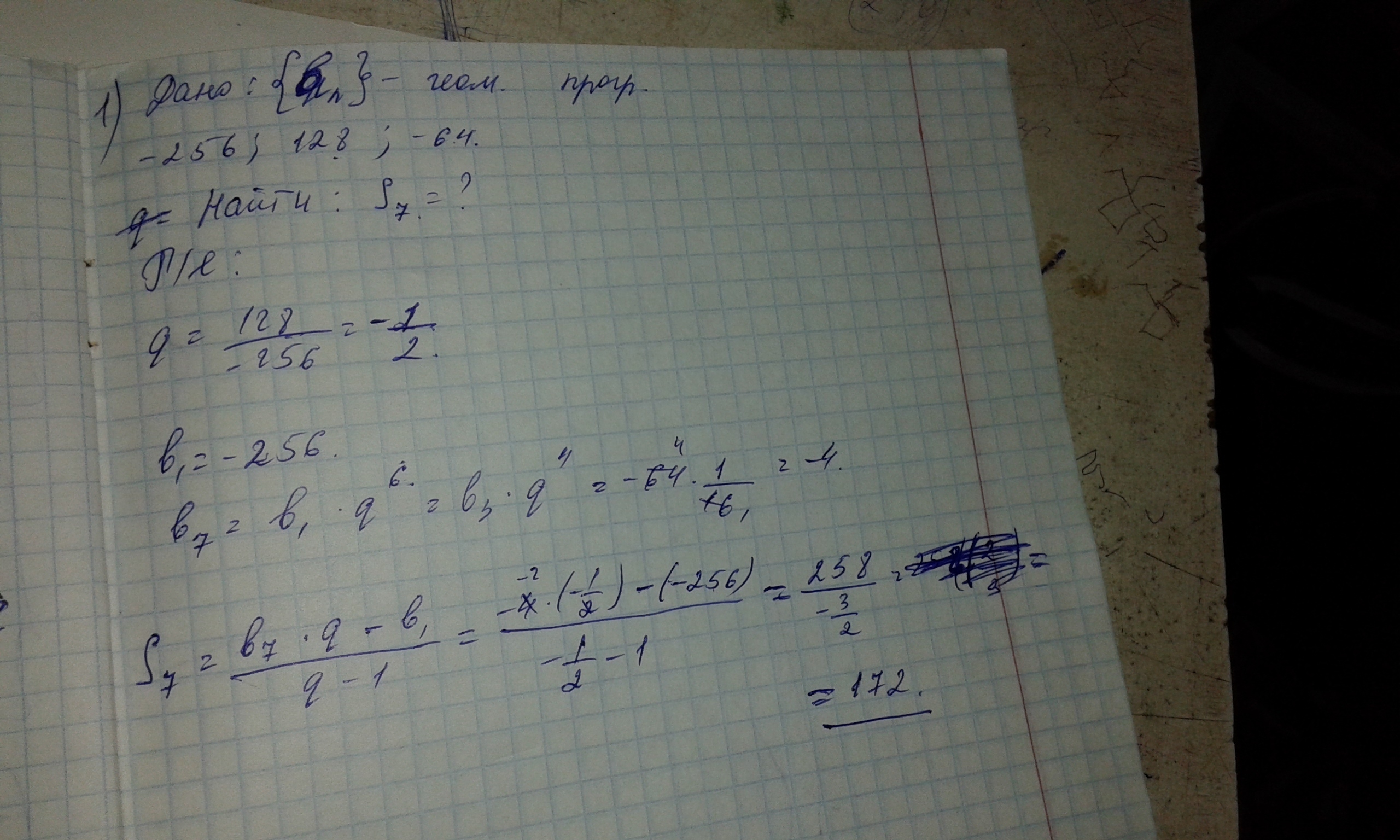 1.Выписаны первые несколько членов геометрической прогрессии: -256; 128; -64... Найдите сумму первых семи её членов.