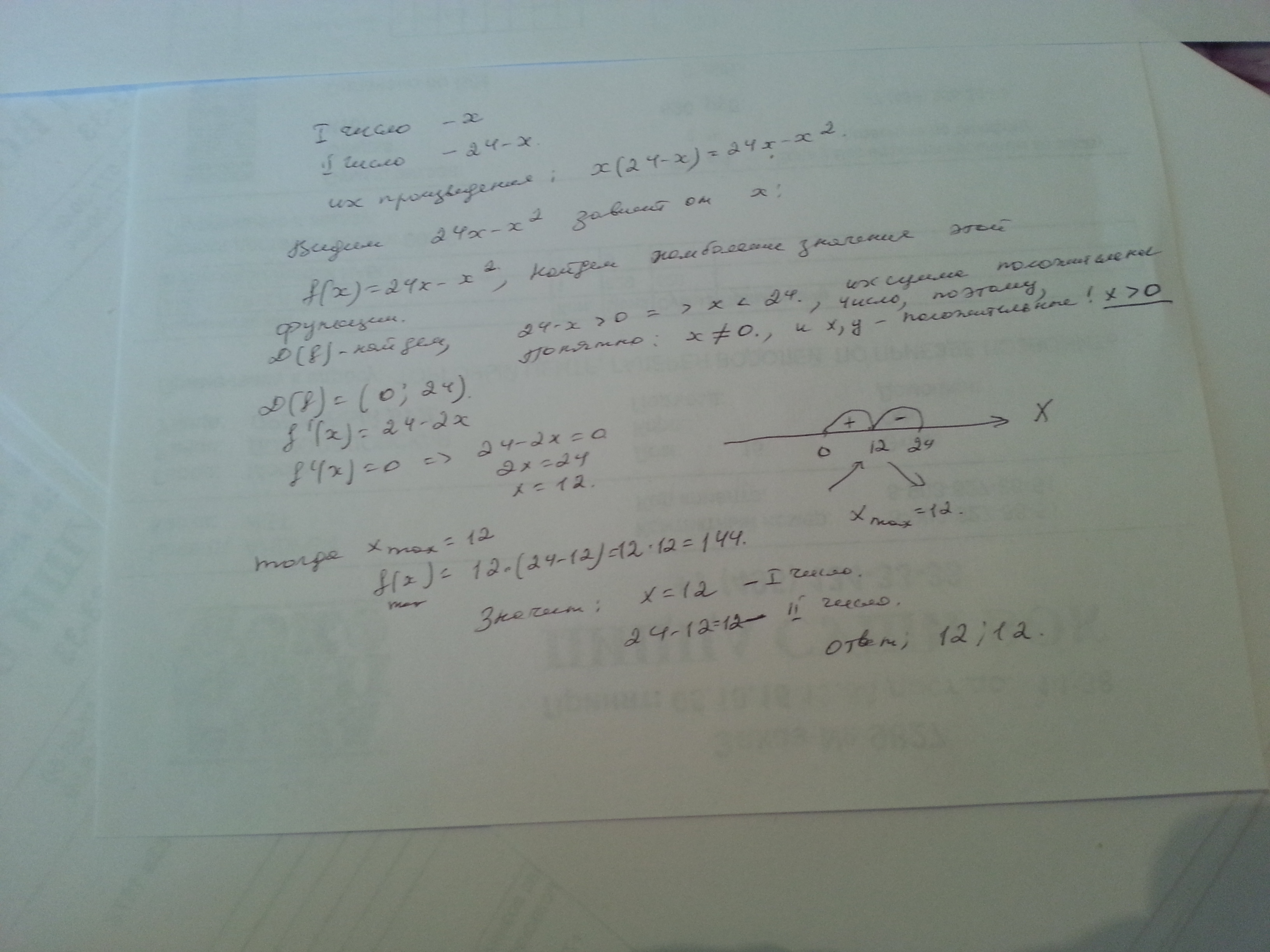 Сума двох цілих чисел 24.Знайти ці числа ,якщо відомо,що їх добуток набуває максимального значення