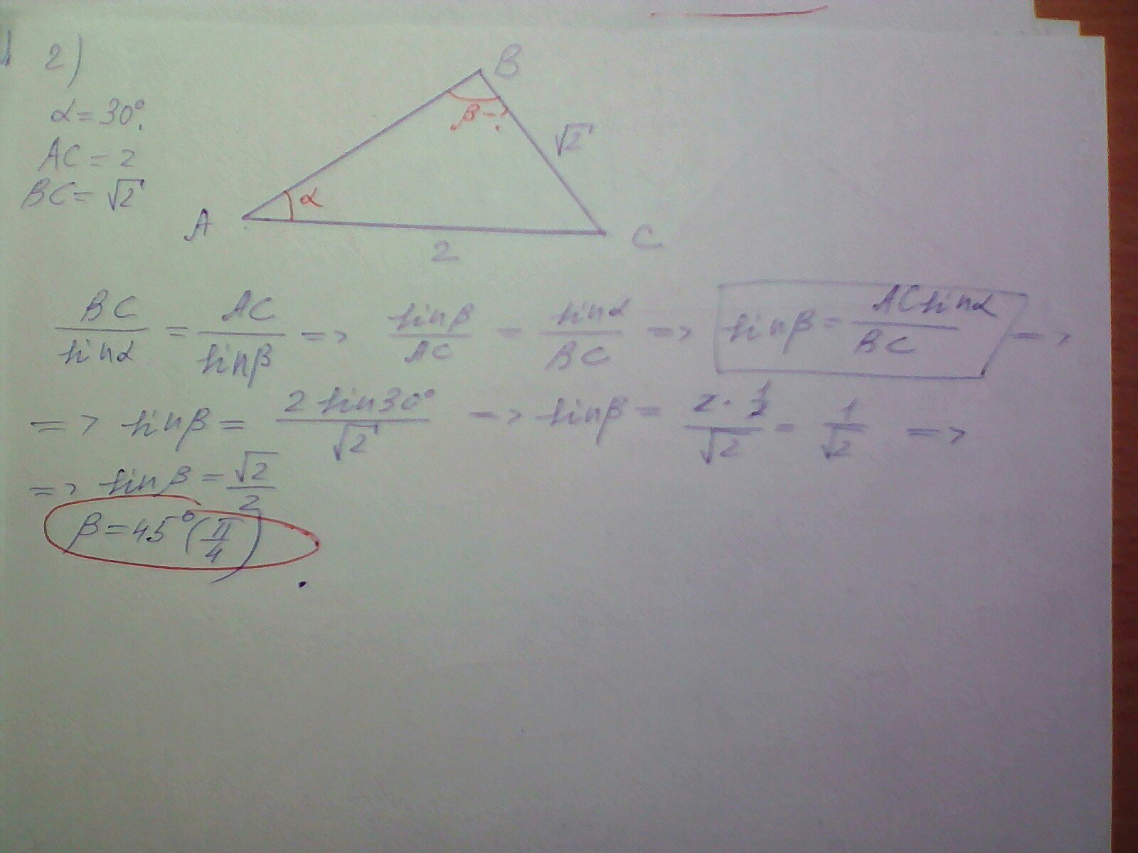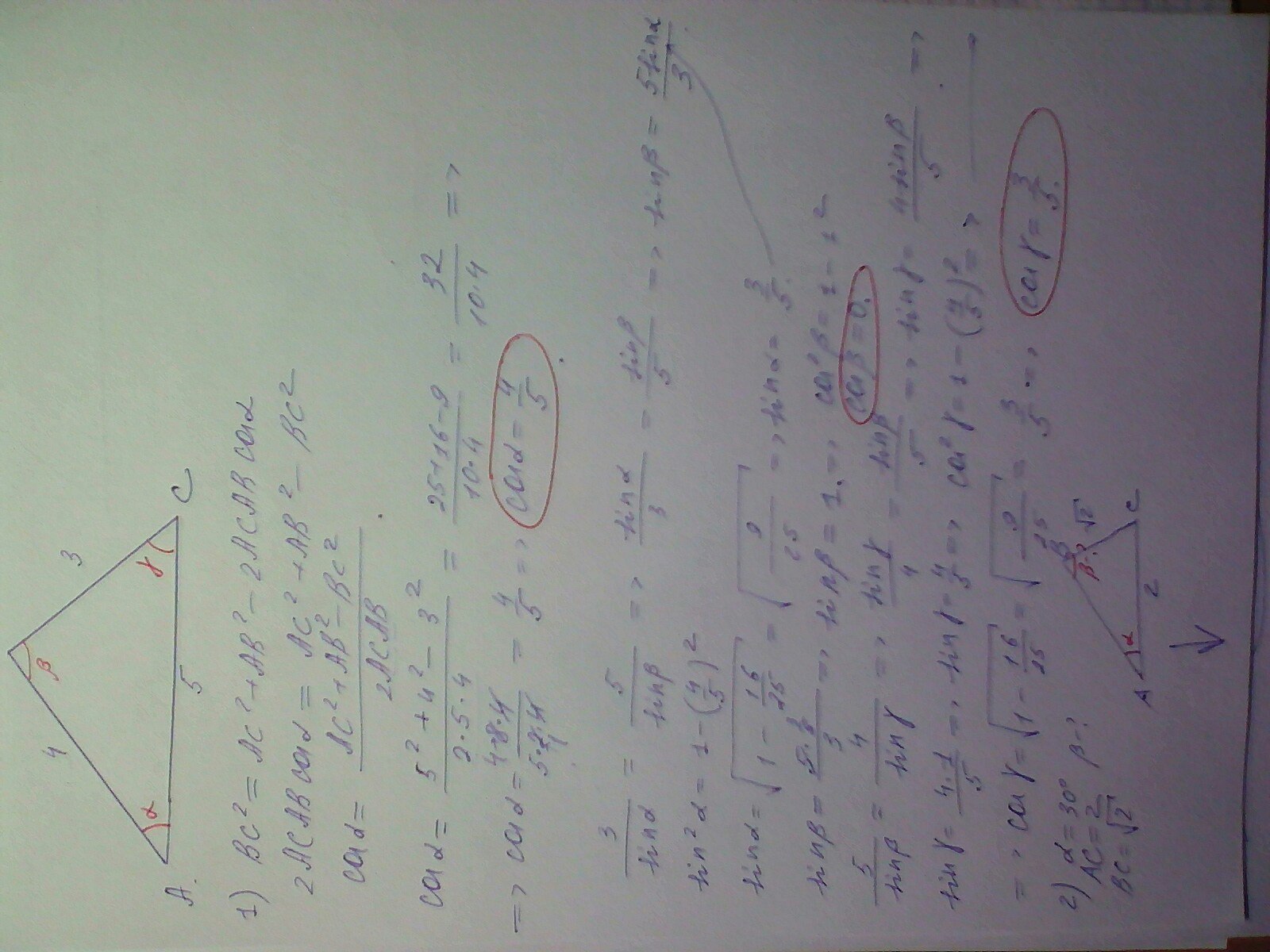 Пожалуйста решите!Заранее спасибо! 1).стороны треугольника равны 3 м,4 м и 5 м.Найдите косинусы его углов 2).Найдите угол В,если в треугольнике АВС угол А=30гр. АС=2 см,ВС=корень из 2 см?