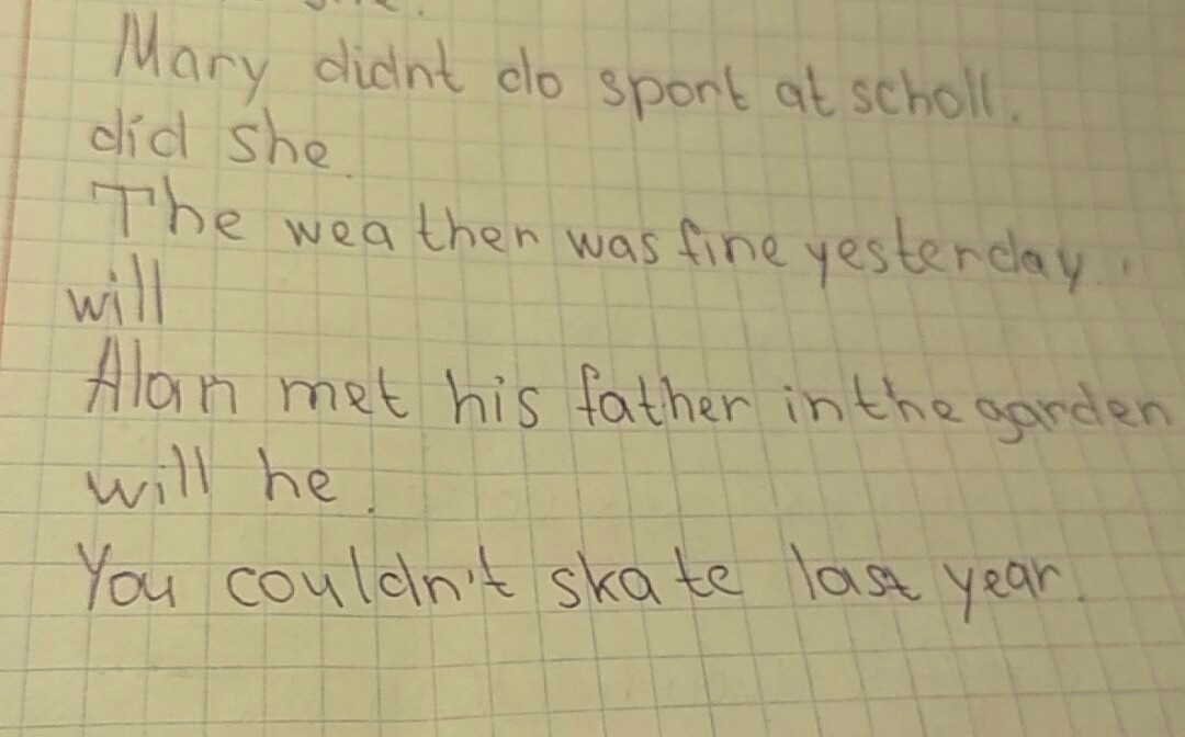 1. did Mary do ...? 2.will weather be fine tomorrow ? 3.will he meet ...? 4. did you can skate...?