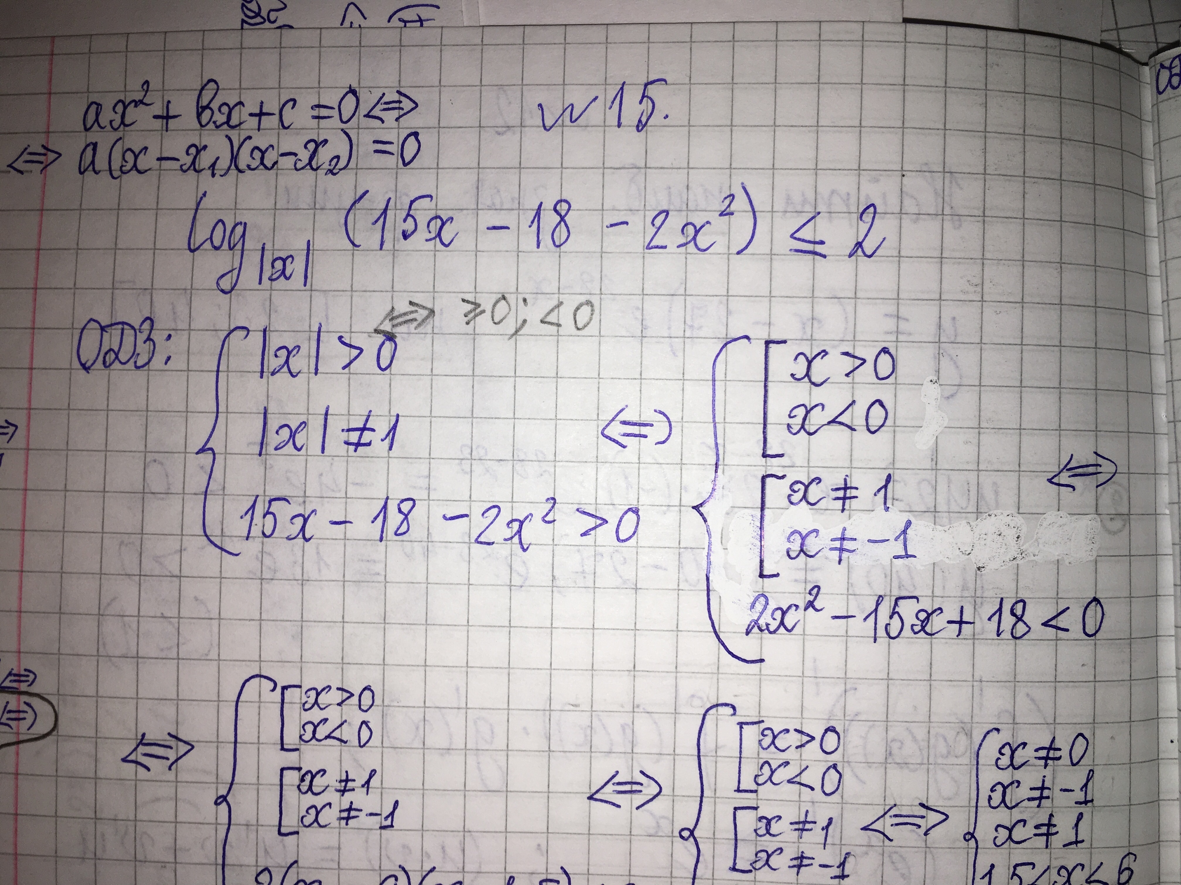 Log |x| ( 15x - 18 - 2x² ) ≤ 2 .