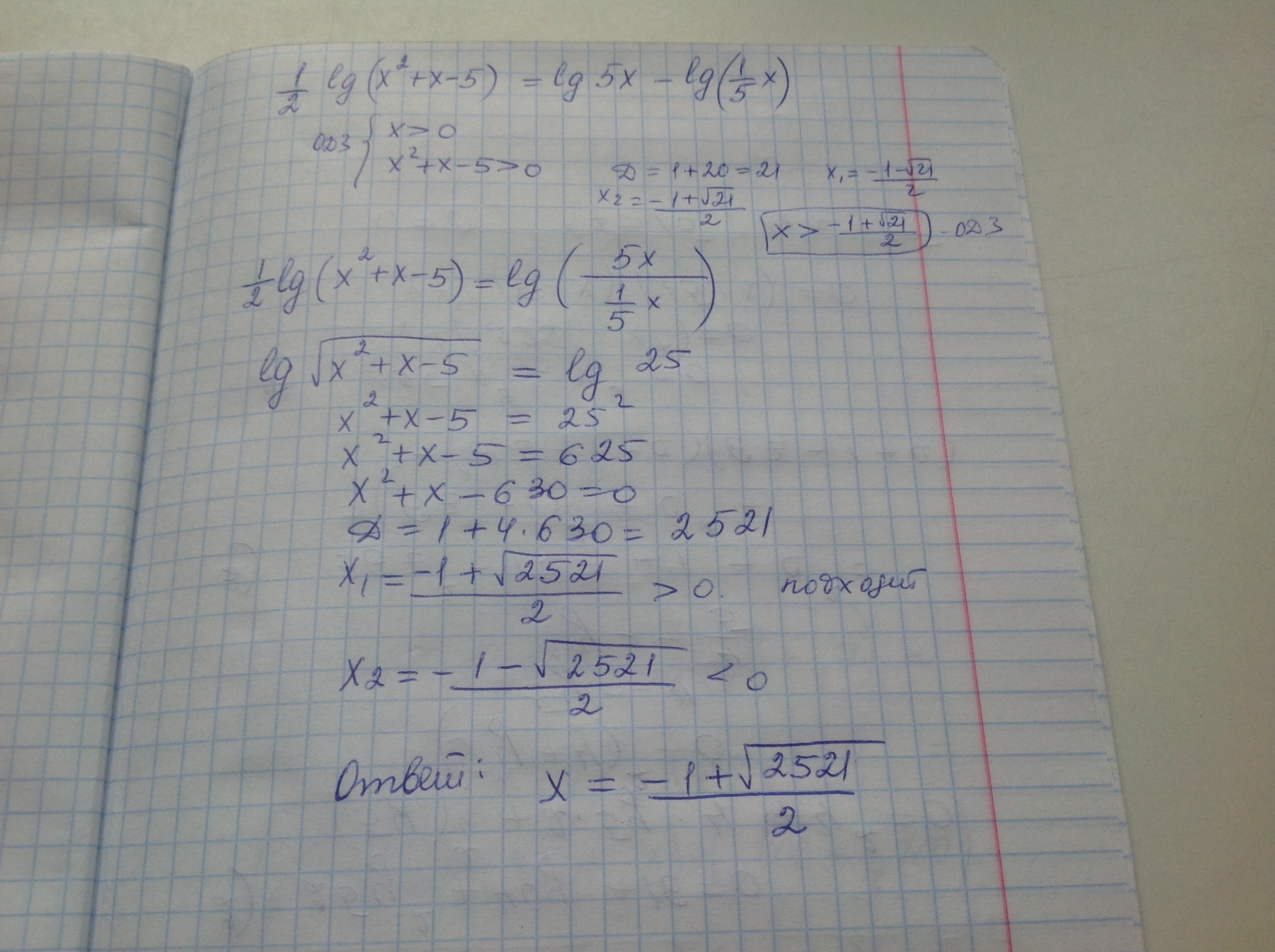 Помогите решить, пожалуйста пример 1/2lg(x^2+x-5)=lg5x-lg(1/5x)