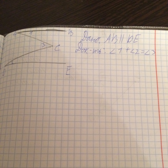 Дано: АВ||DE. Точка С расположена между прямыми АВ и DE и соединена с А и D. Образовавшиеся углы обозначены: