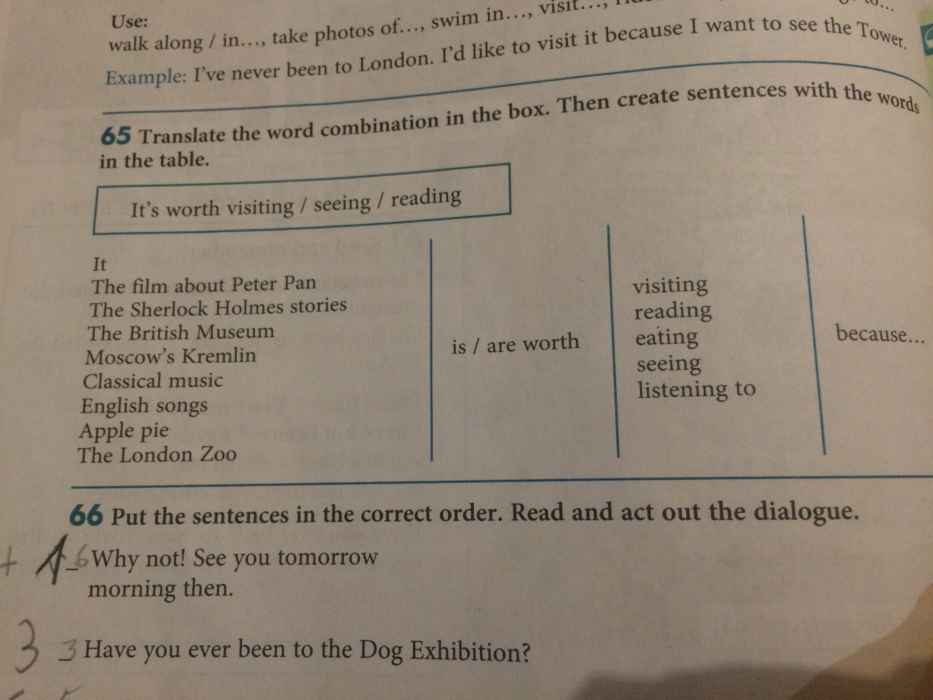 The British Museum/Moscow's Kremlin/The London Zoo is worth visiting because museums contain tons of unique artifacts/it's a famous landmark/it contains lots of different and exotic animals. (Музей - Артефакты, Кремль - Достопримечательность, так далее.)