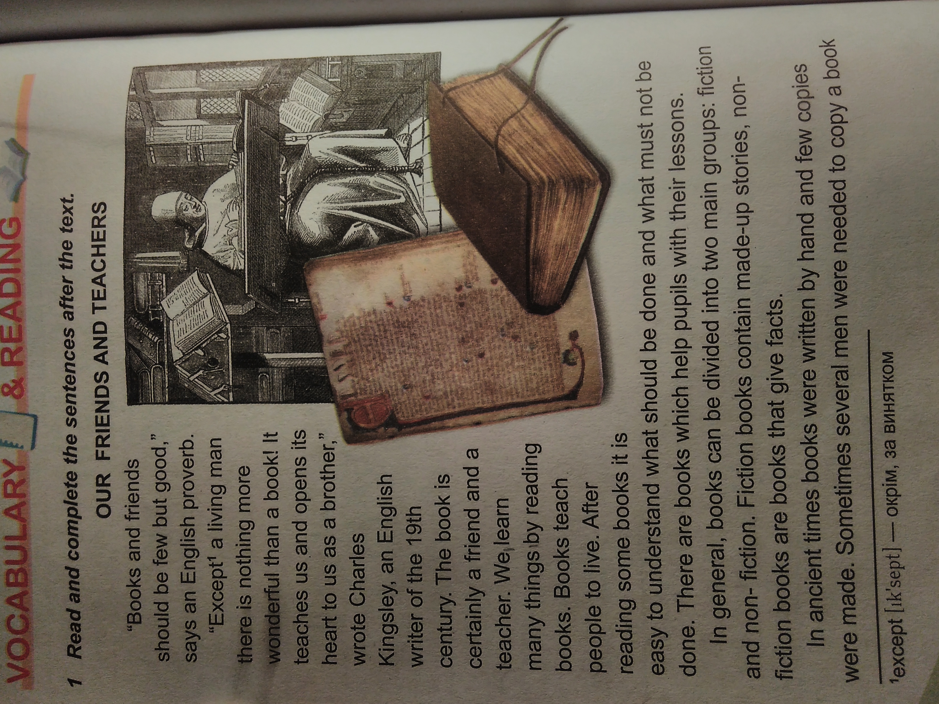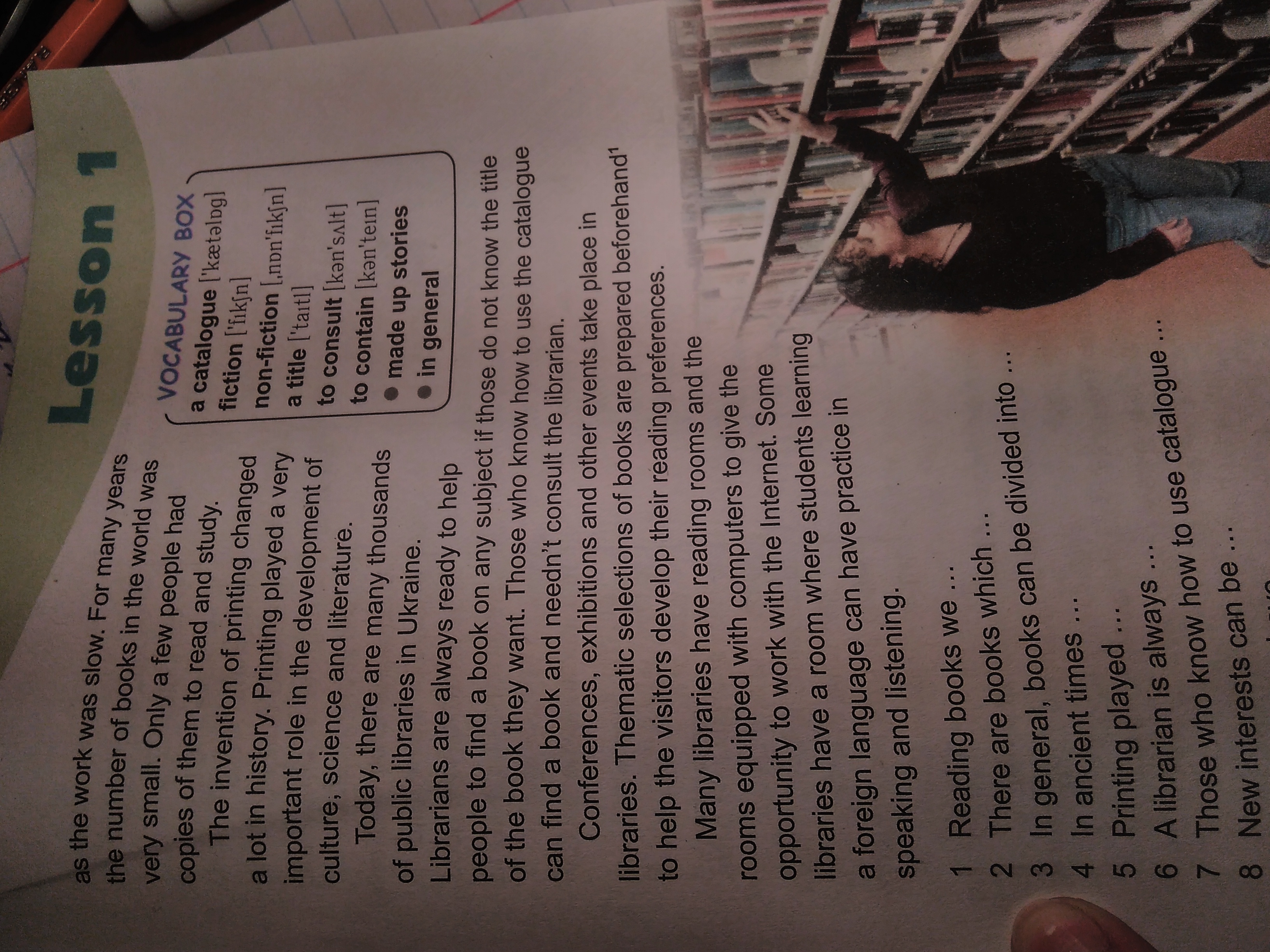 "Книг и друзей должно быть мало, но они должны быть хорошими," - гласит английская пословица."Кроме живого человека, нет ничего более чудесного, чем книга! Она учит нас и открывает свое сердце; она для нас, как брат", - писал Чарльз Кингсли, английский писатель 19-го века. Книга, конечно, друг и учитель. Мы учимся многим вещам, читая книги. Книги учат людей жить. После чтения некоторых книг очень легко понять, что следует делать и чего не надо делать. Есть книги, которые помогают учащимся с уроками.В общем, книги можно разделить на две основные группы: художественные и нехудожественные. Фантастические книги содержат выдуманные истории, научно-популярные книги - это книги, которые дают факты. В древние времена книги были написаны от руки и делалось несколько копий. Иногда несколько человек было нужно, чтобы скопировать книгу, так как работа была медленной. В течение многих лет количество книг в мире было очень маленькое. Только у нескольких человек, были копии этих книг, чтобы читать и изучать.Изобретение печатания многое изменило в истории. Печать сыграла важную роль в развитии культуры, науки и литературы.Сегодня в Украине много тысяч публичных библиотек. Библиотекари всегда готовы помочь людям найти книгу по любому предмету, если читатели не знают название книги, которая им нужна. Те, кто знают, как пользоваться каталогом, могут сами найти книгу и не консультироваться с библиотекарем.Конференции, выставки и другие мероприятия проходят в библиотеках. Списки для выбора книг готовятся заранее, чтобы помочь посетителям развивать своё чтение. Во многих библиотеках есть читальные залы и комнаты, оборудованные компьютерами, чтобы дать возможность работать с Интернетом. В некоторых библиотеках есть комнаты, где студенты, изучающие иностранный язык, могут иметь практику в говорении и слушании.