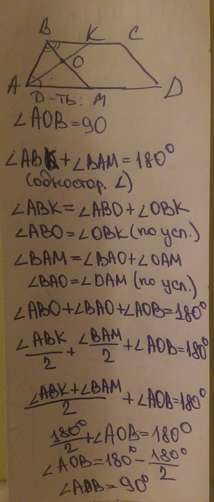 Помогите, пожалуйста, срочно! Дано: ABCD-трапеция, т.е. BC||AD; BM-биссектриса угла B; AK-биссектриса угла A.