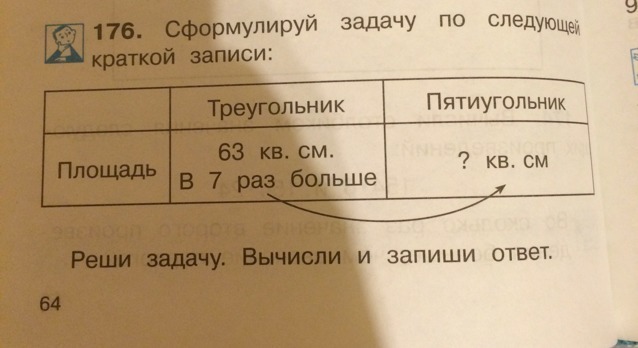 Сформулируй задачу по следующей краткой записи треугольник 63 кв.см. в 7 раз больше пятиугольник ?кв.см.реши задачу вычисли и запиши ответ
