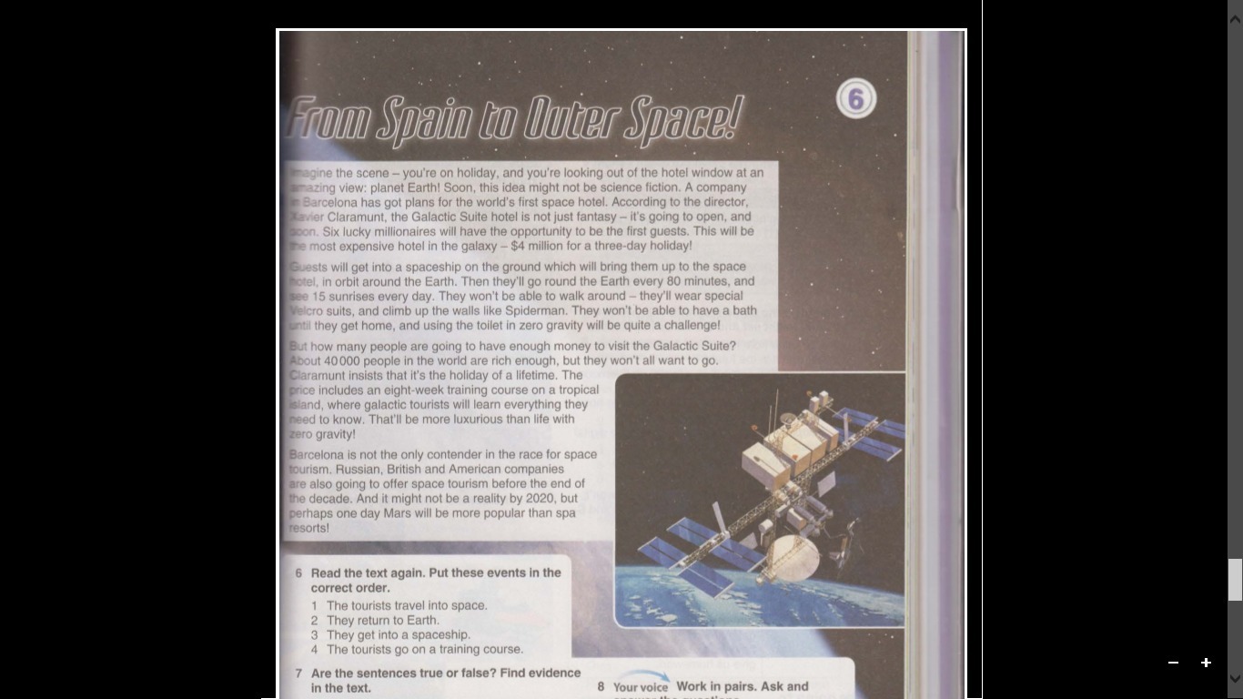 Представьте картину : вы на отдыхе, и через окно в отеле вы видите чудесный вид: планету Земля! Скоро эта идея не будет только научной фантастикой. Компания из Барселоны имеет в планах создать первый во всем мире космический отель! Согласно директору, (его имя), Галактический отель будет не фантастикой - совсем скоро он откроется. 6 везучих миллионеров будут иметь возможность быть первыми гостями. Это будет самый дорогой отель в мире - 4 миллиона долларов за трех-дневный отдых.
