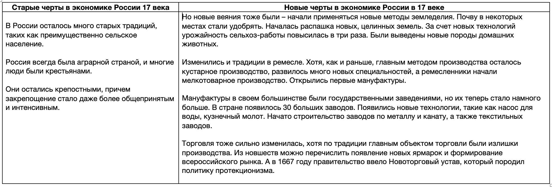 Заполнить таблицу старые черты и новые веяния в экономике России 17 века можно так: