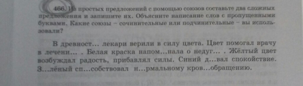 ВЫ древности лекари верили в силу цвета, ПОТОМУ ЧТО (подчинительный союз) он помогал врачу в лечении. Белая крраска напоминала о недуге, А жёлтый цвет возбуждал радость, прибавлял силы. (сочинительный союз)