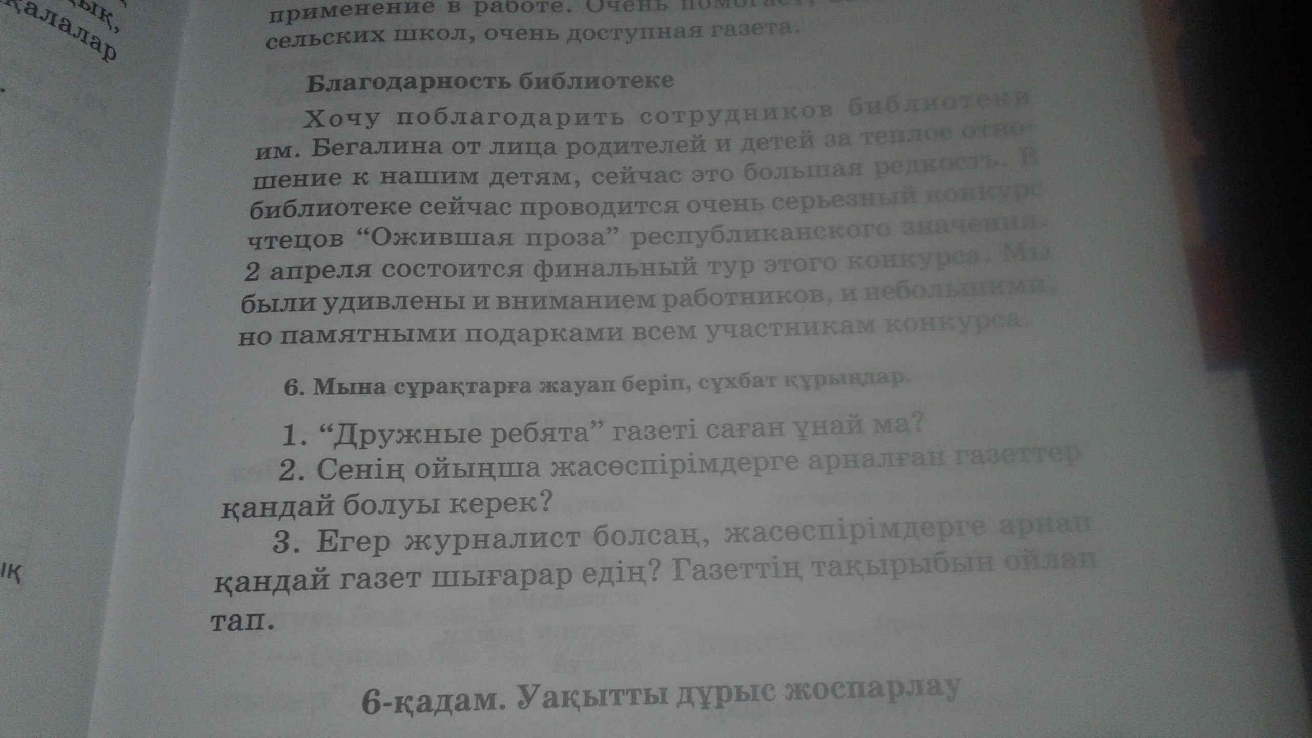 Мен Бегалин атындағы кітапханаға ата-аналар мен балалар атынан оларға деген, осындай жылы көзқарасыныз үшін алғыс білдіргім келеді.Себебі бұл қазіргі таңда өте сирек.(кездеседі можно даписать)Кітапханада қазір өте күрделі оқырмандар бəсекелестігі(конкурс,также используется сайысы) Республикалық маңызы бар Ожившая проза атымен өтуде.2 сəуірде бұл сайыстың соңғы кезеңі болады.Біз сондай-ақ жұмысшыларға да,кішігірім,бірақ естелікке қалсын деп,осыған қатысқан оқушыларға берілген сыйлықтарға да таңғалдық.