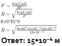 На каком расстоянии нужно расположить два заряда : q1 = 5*10-9Кл и q2 = 6*10-9Кл, чтобы они отталкивались друг от друга с силой 12*10-9Н