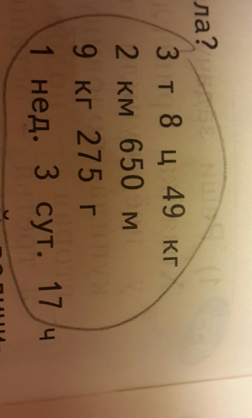 3 т. 8 ц. 49 кг.=. 2 км. 650 м.=. 9 кг. 275 г.=. 1 нед. 3 сут. 17 ч.=