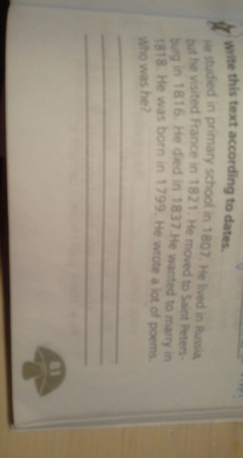 Нe was born in 1799. He studied in primary school in 1807. He moved to St. Petersburg in 1816. He wanted to marry in 1818. He lived in Russia but he visit France in 1821. He died in 1837. He wrote a lot of poems. Who was he? –A. S Pushkin